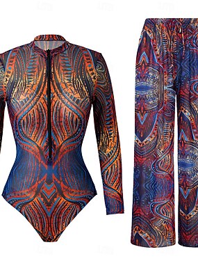 Dames Eénstuk Badpak met Rok Boho Jurk Buikcontrole Hoge Taille Slank Rugloos Vakantie Strandkleding Grafisch Geometrisch Ronde Hals Mouwloos Lange Mouw Badpakken