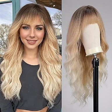 medium gemengd blond krullend golvend pruik synthetische pruik yaki steil met pony pruik halflang blond synthetisch haar damesblond