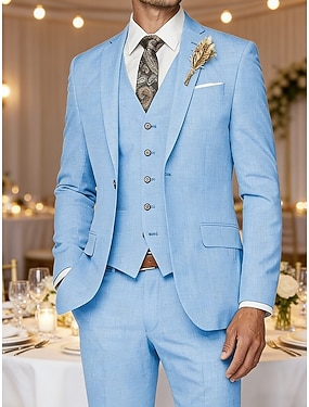 Heren Linnen pakken Strand bruiloft Bruiloft Wit Hemelsblauw Lente, Herfst, Winter, Zomer Pak Inkeping Effen Strak 3-delige set Enkele rij knopen met twee knopen