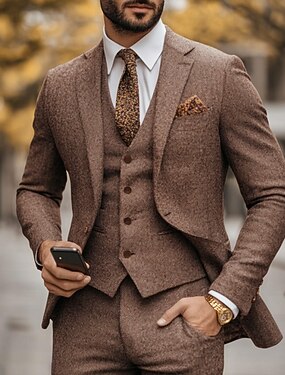 Heren Smoking Tweed -pakken Casual liiketoiminta Bruin Donker Grijs Herfst Pak Ingesneden revers Formeel Visgraat Strak 3-delige set Enkele rij knopen met één knoop