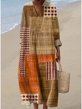 Dames Maxi-jurk Zonnejurk Hemdjurk Vakantie Casual Strand Uitgaan Ruim Passend Grafisch Geometrisch Abstract Lange mouw V-hals Bruin Khaki Zomer Lente