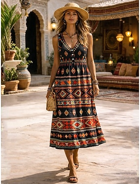 Dames Halflange jurk Zonnejurk Schede jurk Zomerjurk Vakantie Casual Boho Dagelijks Feestdagen Zomerjurk Normale pasvorm Geometrisch Mouwloos V-hals blauw Bruin Zomer