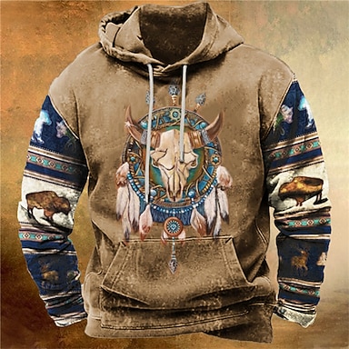 Voor heren Grafisch Tribal Cowboy Trui met capuchon Hoodies Sweatshirt Dagelijks Etnisch Casual Vintage Retro Lange mouw Capuchon Vakantie Buitensporten Feestdagen Streetwear blauw Bruin Khaki