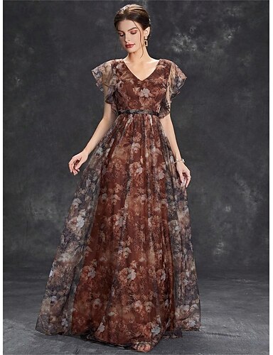 A-Lijn Quinceanera Jurken Elegante Jurk Formele Bruiloft Vloerlengte Mouwloos V-Hals Chiffon met Bloemenprint