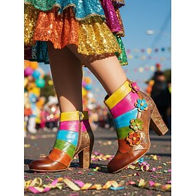 Vrouwen's Mardi Gras Multikleuren Lederen Blokhak Laarzen met Golvend Ontwerp Comfortabel en Vibrant Ideaal voor Carnaval en Feestelijke Gelegenheden