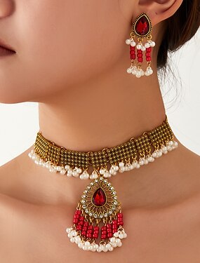 Vintage parel- en edelsteen sieradenset – turquoise en parel choker ketting & oorbellen voor dames