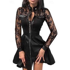 Dames Mini-jurk Zwarte jurk Kanten jurk Leren Jurk Modieus Modern Club Feestdagen Uitgaan Normale pasvorm Effen Lange mouw Opstaand Zwart Lente Herfst
