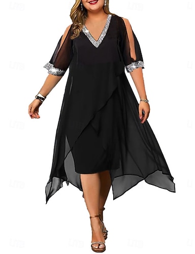 Dames Grote maten Zwarte jurk Effen Kleur V-hals Halve mouw Lente Herfst Elegant Modieus Modern Halflange jurk Feest Bruiloft gast Jurk