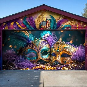 Mardi gras Garagedeurafdekking Grote Hangende Masker Veer Luxe 3D Levendig Feesten Voor buiten Schietachtergronden Voordeur Gemaskerd bal Huisdecoratie