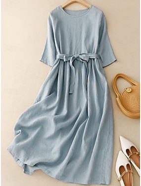 Dames Halflange jurk Imitatie katoenlinnen Hemdjurk Witte katoenen jurk Basic Casual Dagelijks Vakantie Normale pasvorm Effen 3/4 mouw Strakke ronde hals Zwart Wijn Khaki Grijs Zomer
