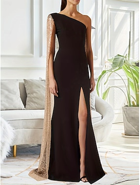Strak kolom Tot de grond Avondjurken Baljurk met overrok Formele kleding Elegant Glitter Mouwloos Eén-schouder Avond Feest Bruiloft Pailletten Stretch crêpe met Ruches Pailletten Split