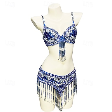 Samba Dancewear Diepblauwe Ornate Bedeelde Sequin Buikdans Set Performance Kostuum