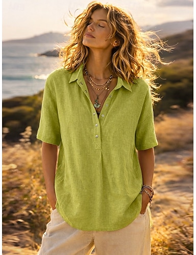 Dames Blouse Overhemd van imitatie linnen Knop Effen Kleur Vintage Stijlvol Casual Halve mouw Overhemdkraag Normale tops Dagelijks blauw Zwart Wit Blozend Roze Groen Zomer Lente Herfst