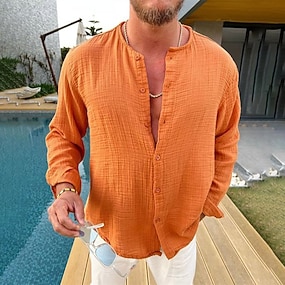 Voor heren Overhemd Zomer overhemd Overhemd met knopen Designer overhemd Oranje Lange mouw Effen Zonder Kraag Straat Dagelijks Button-omlaag Kleding Katoen Katoenmix Modieus Casual Comfortabel