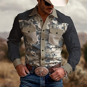 Voor heren Camouflage Kleur Westers overhemd Cowboyshirt Lange mouw Westers Vintage Retro Casual Buiten Lente Herfst Strijkijzer Dichtknopen shirts met kraag Twee zakken aan de voorkant blauw