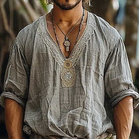 Voor heren Overhemd Linnen overhemd Viking-stijl Popover-shirt Zomer overhemd Strand Kleding Effen Kleur Vakantie Straat Wit blauw Oranje Groen Lange mouw Zonder Kraag Kleding Trekkoord