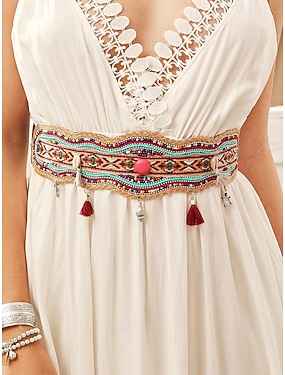 Handgemaakte bohemian damesriem met kralen, elastische stretchband met kwastjes en bedels - kleurrijk geborduurd damesontwerp, perfect voor strandkleding, festivals en zomerse gelegenheden