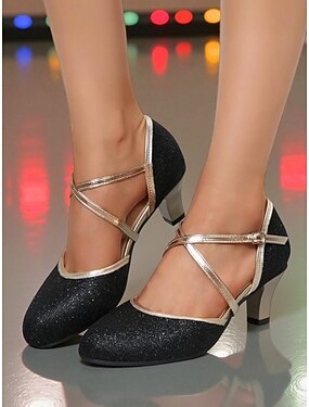 Zwarte glitter kruisbandhakken voor dames - elegante ballroompumps met gouden rand voor uitgaansgelegenheden en avondevenementen