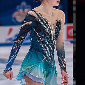 Kunstschaatsjurk Dames Voor meisjes Schaatsen Jurken Blauw Duimopening halo-verf Hoge Elasticiteit Professioneel Wedstrijd Kunstschaatskleding Thermisch Warm Kristal / Bergkristal Lange mouw