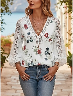 Dames T-shirt Kant Lapwerk Afdrukken Bloemig Modieus Modern Casual Lange mouw V-hals Normale tops Dagelijks Weekend Wit Zomer Lente Herfst