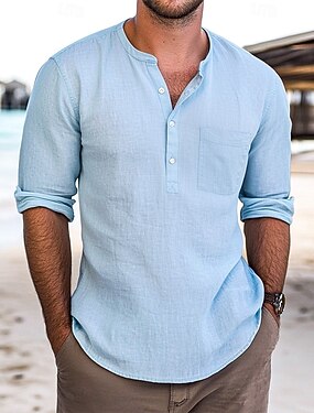 Voor heren Overhemd Linnen overhemd Zomer overhemd Strand hemd Effen Kleur Vakantie Casual Zwart Wit Wijn Marineblauw Lange mouw Henley Kleding