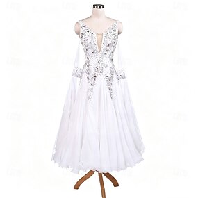 Ballroom dansjurk borduurwerk strass steentjes damesvoorstelling lange mouw wals moderne danskostuums