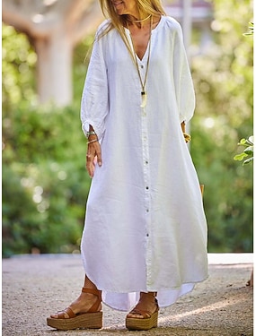 Dames Maxi-jurk Imitatie katoenlinnen Shirtjurk Witte jurk Basic Casual Dagelijks Vakantie Ruim Passend Effen Lange mouw V-hals Zwart Wit Grijs Zomer Lente