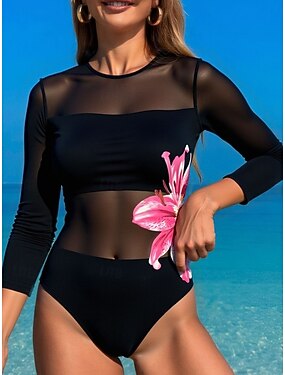 Dames Eéndelig Badpak Sexy Cutout Monokini Mesh Buikcontrole Hoge Taille Slank Vakantie Strandkleding Bloem Ronde Hals Lange Mouwen Badpakken