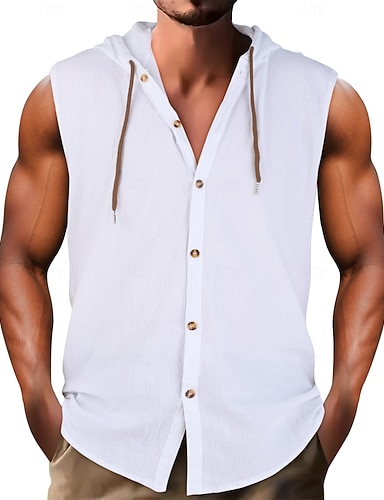 Voor heren Overhemd Linnen overhemd Zomer overhemd Strand Kleding Overhemd met capuchon Mouwloos shirt Effen Kleur Vakantie Straat Zwart Wit Marineblauw Hemelsblauw Mouwloos Capuchon Zomer Lente