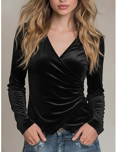 Dames Fluwelen Effen Kleur Simpel Elegant Stijlvol Basis Lange Mouw V-Hals Reguliere Tops Blauw Zwart Wijnpaars Groen Winter