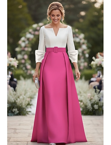 A-lijn Strak kolom Tot de grond Bruiloft gast jurk Formele jurk Avondjurk Moeder van de bruid jurk 3/4 mouw V-hals Elegant Formeel Bruiloft gast Semi formeel Satijn met Sjerp / Lint Kleurenblok