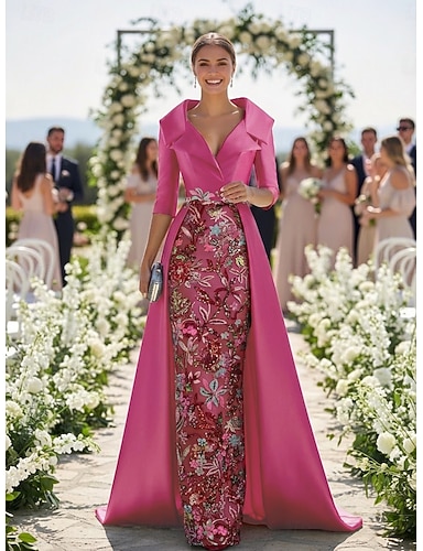 A-lijn Strak kolom Tot de grond Kralenborduurwerk Bruiloft gast jurk Formele jurk Moeder van de bruid jurk 3/4 mouw V-hals Overhemdkraag Elegant Vintage Luxueus Formeel Satijn met Appliqués Bloem