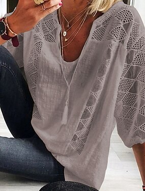 Dames Pointelle shirt Oogje top Blouse Kanten topjes Kant Effen Stijlvol Modern 3/4 mouw V-hals Normale tops Casual Dagelijks Strand Zwart Geel Grijs Zomer