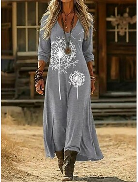 Dames Maxi-jurk Boho-jurk Vintage Jurk Casual jurk Vintage Dagelijks Buiten Vakantie Normale pasvorm Bloemig Lange mouw V-hals Grijs Lente Herfst