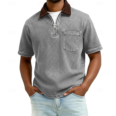 Voor heren Polo met rits Gewassen overhemd Casual Revers Kwart ritssluiting Korte mouw Vintage Effen Kleur Lapwerk Verdrietig Zomer Lente Alle seizoenen Normale pasvorm Legergroen Zwart Blozend Roze