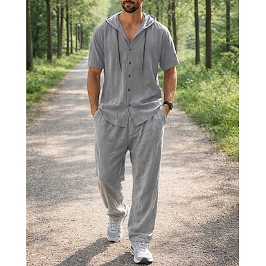 Voor heren Overhemd linnen overhemd Popover-shirt Normaal shirt Katoenen shirt Effen Vakantie Straat Wit Marineblauw Hemelsblauw Groen Korte mouw Band Kraag Zomer Kleding Knop