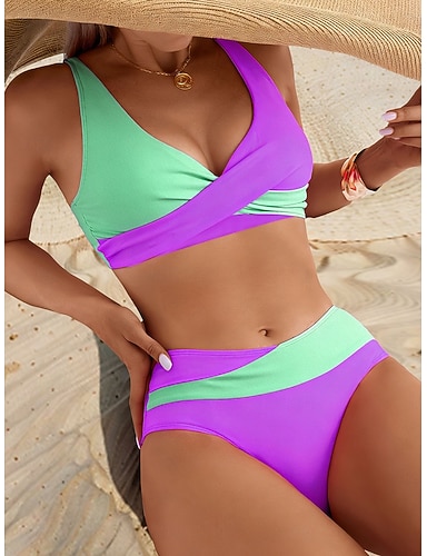 Dames Bikini 2 Delig Badpak Colorblock Hoge Taille Slank Rugloos Vakantie Strandkleding Streep V Hals Mouwloze Badpakken