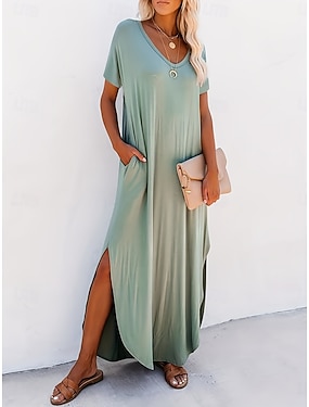 Dames Maxi-jurk Zomerjurk Casual Dagelijks Normale pasvorm Effen Korte mouw V-hals Zwart Blozend Roze Groen Zomer