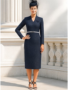 Sheath Kolom Thee Lengte Feestjurk Cocktails jurk Bruiloft Gast Jurk Moeder van de Bruid Jurk Lange Mouw V Hals Elegante Vintage Formeel Wolachtig met Sjaal Lint