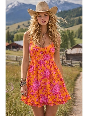 Dames Mini Jurk Linnenachtig Boho Strand Jurk Vintage Jurk Jurk Bohemia Vakantie Vintage Reguliere Pasvorm Floral Mouwloos Scoop Hals Oranje Zomer Lente