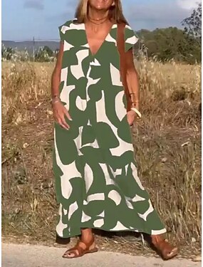 dames grafische v-hals maxi-jurk mouwloos zomer lente