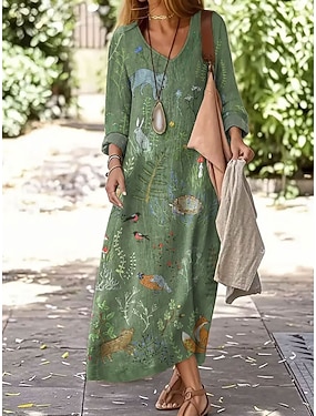 Dames Maxi Jurk Linnenachtig Ademend Lichtgewicht Zomerkleed Shift Jurk A-lijn Jurk Vakantie Casual Boho Strand Uiting Losse Pasvorm Bloem Graphic 3/4 Lange Mouwen Ronde Hals Blauw Groen Khaki
