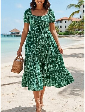 Dames Halflange jurk A lijn jurk Vakantie Casual Buiten Uitgaan Standaard pasvorm Bloemig Korte mouw Vierkante hals Groen Zomer Lente