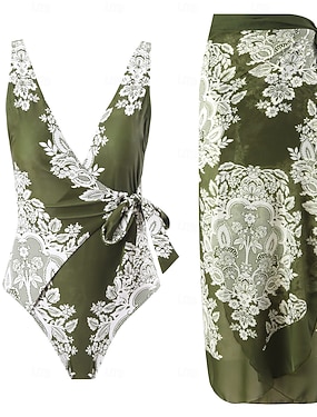 Dames Zwemkleding Een stukje 2 stuks Monokini Rok Zwempak Buikcontrole Hoge taille Slank Blote rug Vakantie Strand Kleding Bloemig V-hals Mouwloos Badpakken
