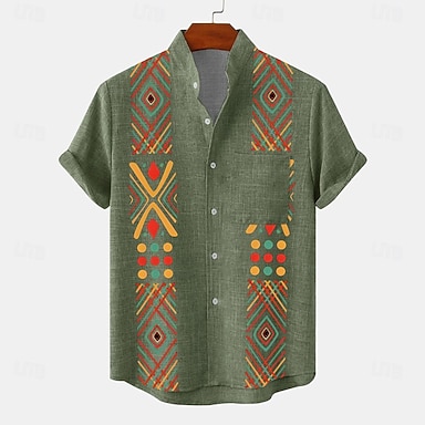 Voor heren Overhemd Overhemd met knopen Korte mouw Vintage Casual Tribal Vakantie Dagelijks Zomer Lente Band Kraag opa kraag Afdrukken Groen Khaki Beige