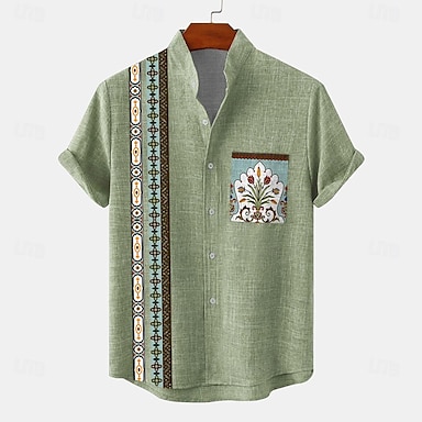 Voor heren Overhemd Overhemd met knopen Korte mouw Vintage Casual Tribal Vakantie Dagelijks Zomer Lente Band Kraag opa kraag Afdrukken Groen Khaki Beige