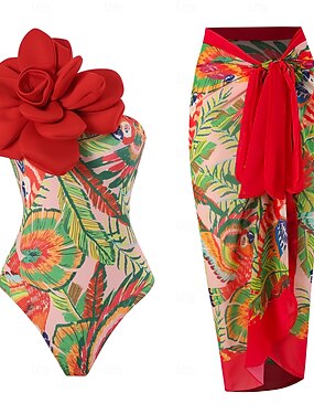 Dames Zwemkleding Een stukje 2 stuks Monokini Rok Zwempak Buikcontrole Hoge taille Slank Blote rug Vakantie Strand Kleding Bloemig V-hals Mouwloos Badpakken