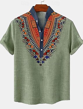 Voor heren linnen overhemd Henley-shirt retro-overhemden Vintage overhemd Etnisch shirt Etnisch Vakantie Dagelijks blauw Groen Khaki Korte mouw Mandarijn Kraag Zomer Lente Kleding Afdrukken