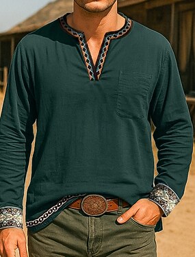Voor heren Overhemd Linnen overhemd Viking-stijl Zomer overhemd Strand hemd Westers overhemd Effen Kleur Vakantie Casual Zwart Wit Groen Lange mouw V-hals Kleding Trekkoord
