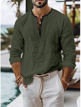 Voor heren Overhemd Linnen overhemd Zomer overhemd Strand hemd Effen Kleur Vakantie Casual Zwart Wit Groen Lange mouw V-hals Kleding Trekkoord